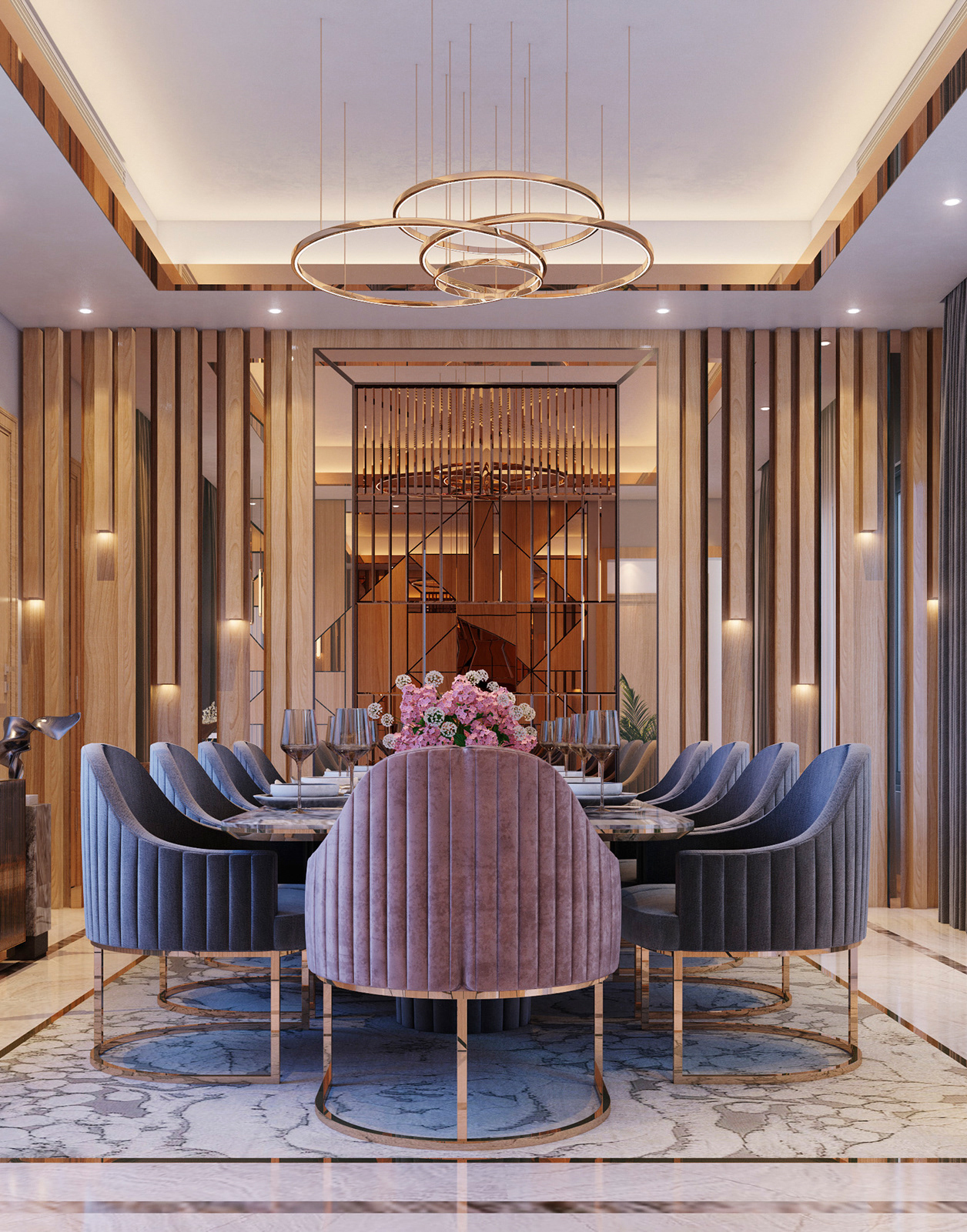 The dining hall is an elegant and refined space designed to create a luxurious dining experience. It is located adjacent to the kitchen, allowing for easy access and seamless flow between the two areas. The hall is spacious, with high ceilings and large windows that bring in an abundance of natural light, creating a bright and airy ambiance.